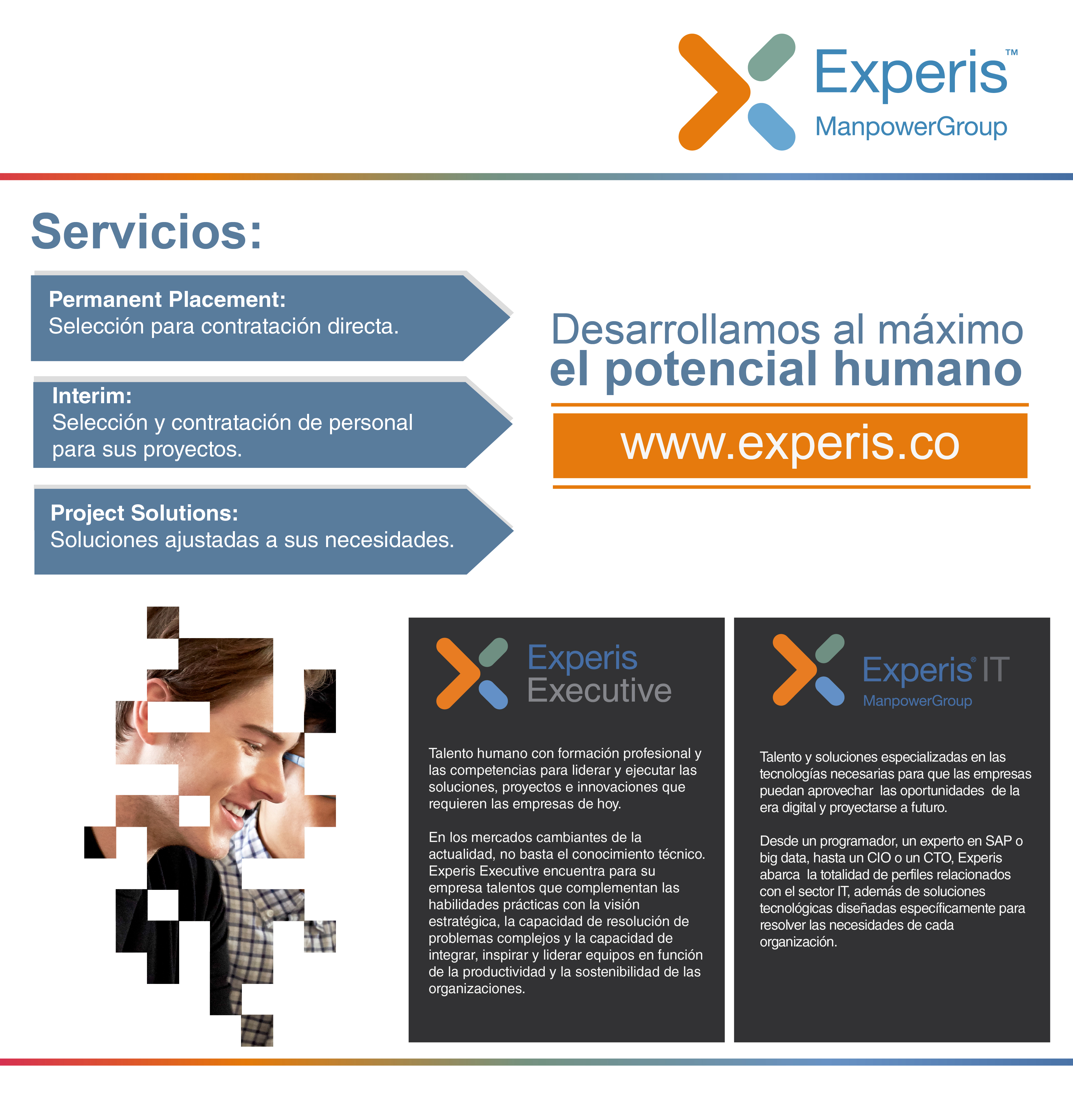 En Experis proveemos talento profesional y soluciones de capital humano con gran agilidad y flexibilidad para tus proyectos.